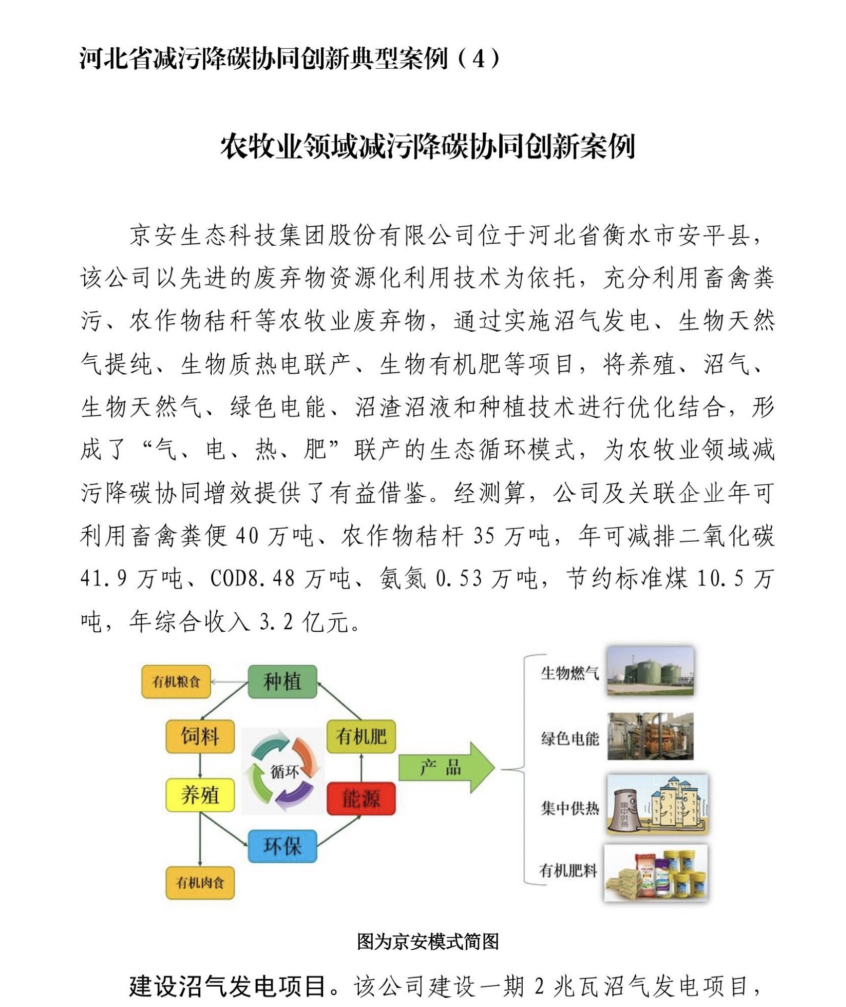 近日,为深入推进减污降碳协同增效,河北省生态环境厅组织开展了减污降碳协同增效典型案例征集工作,经自主申报、专家评审,京安生态集团等7个案例符合减污降碳协同增效要求,成为河北省减污降碳协同创新的典型案例,助力推动减污降碳协同增效工作不断取得新成效。